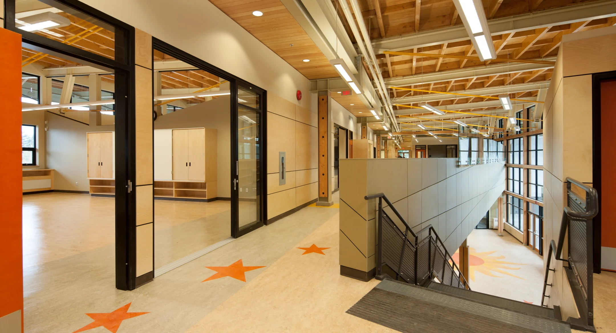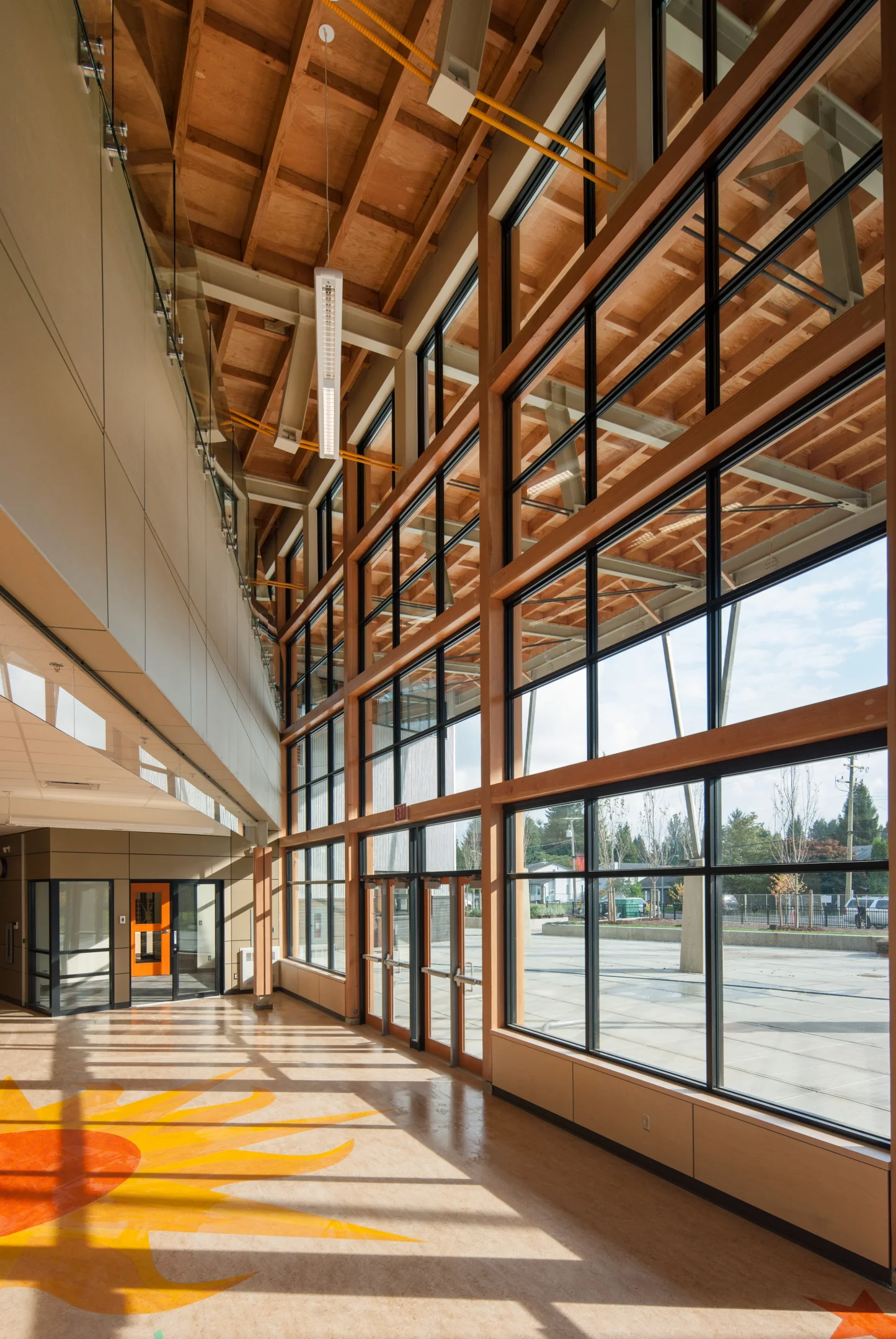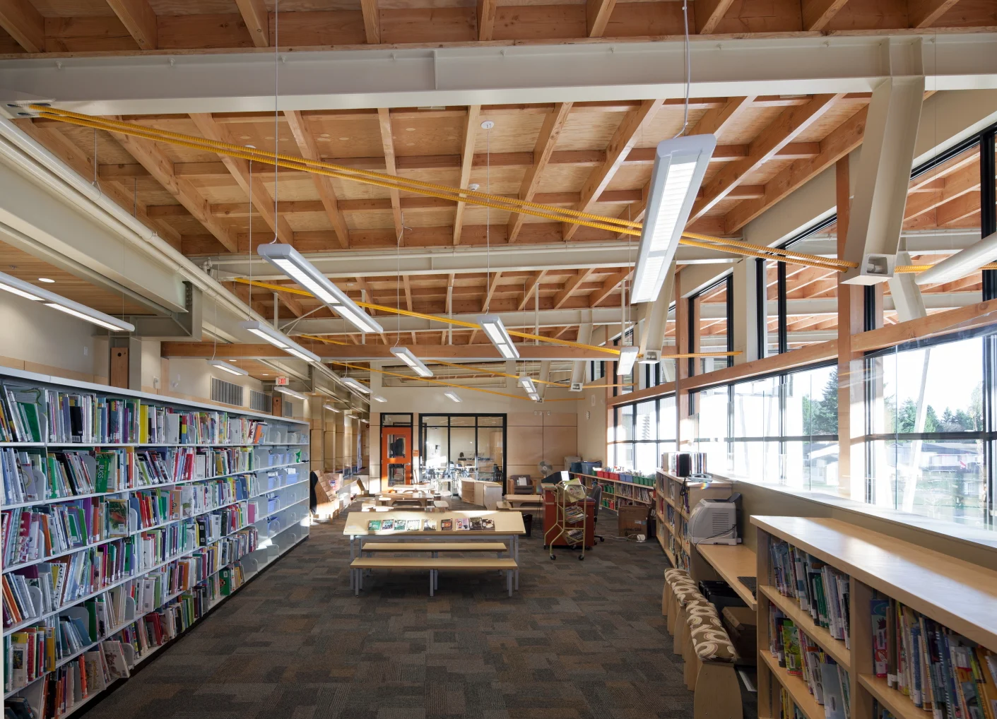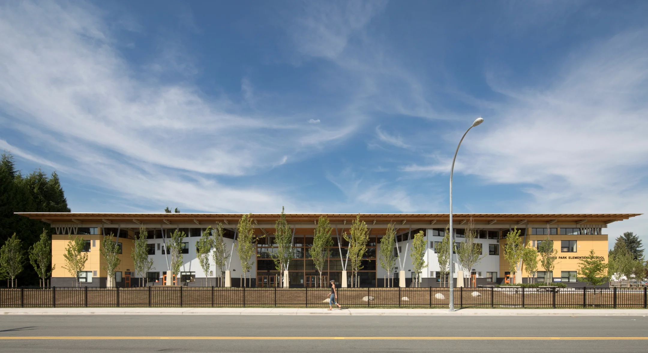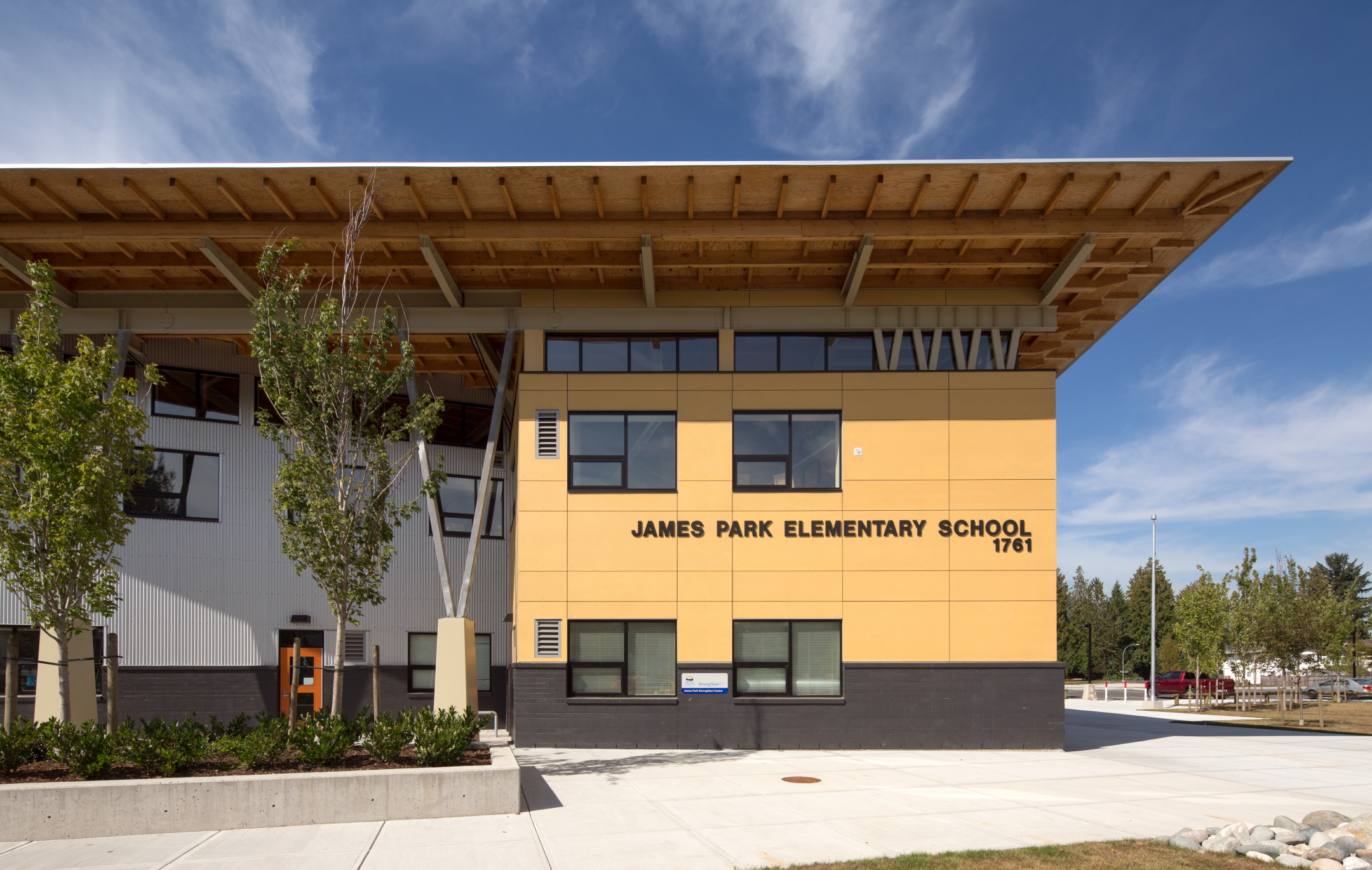 James Park Elementary is a replacement school that features the expected educational spaces put together in a modernized way as well as an integrated community component. An open plan library – the first for this district – overlooks a south facing Learning Commons that is shared by both the school and community. Clerestory windows run the perimeter of the upper floor flooding the classrooms and gym with natural daylight while highlighting an elegant wood roof structure. The sloped butterfly roof covers the entire school and features a central, oversize gutter that directs rainwater to feature catchment pillars on either end. The project targets LEED® Gold.